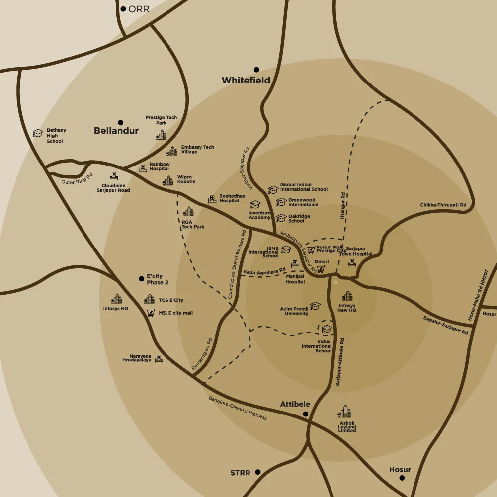 Seamless Connectivity: Directly connects to key areas like Whitefield, Electronic City, and major infrastructure projects like PRR & STRR, SWIFT City, Upcoming Hosur Airport, and the Upcoming Metro.